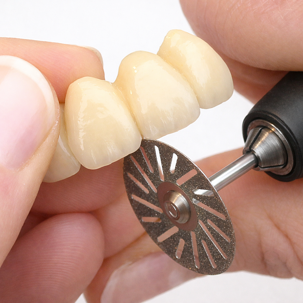 Das Formschleifen der geschichteten Aufbrennkeramik wie VITA VM9 auf Oxidkeramikgerüsten oder auf VMK-Kronen und -Brücken gehört zu den Aufgaben feinkörniger, flexibler Diamantscheiben. Aber Achtung: Schwach diamantierte Scheibenkanten verschleißen schnell, lösen eine punktuelle Überhitzung mit Schwarzverfärbung auf dem rohgebrannten Werkstück aus und verursachen Mikrorisse in der Keramikstruktur.
